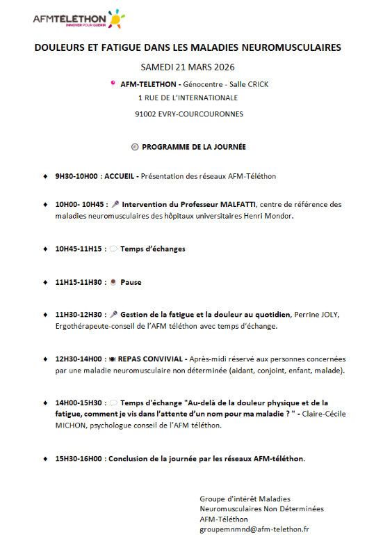Pour toute information, ou inscription, contacter les bénévoles du Groupe d’intérêt sur les Maladies NeuroMusculaires Non Déterminées : groupemnmnd@afm-telethon.fr