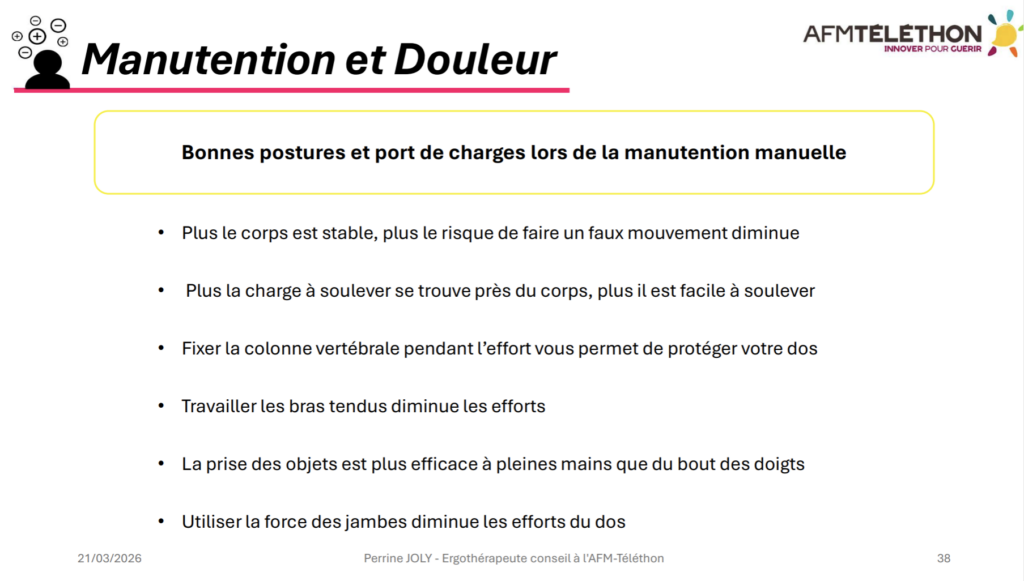 Enfin, elle a mis en avant plusieurs stratégies ergonomiques visant à limiter la fatigue physique :