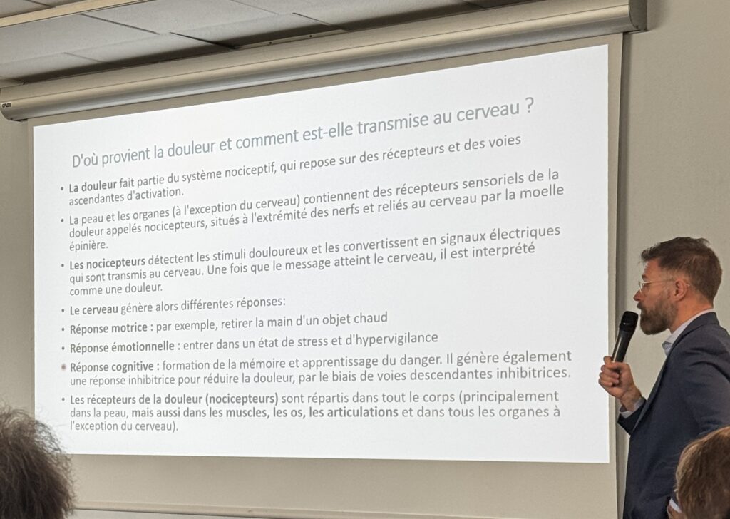 Il a d’abord expliqué l’origine de la douleur et comment le corps transmet ce signal au cerveau. En effet, la douleur naît de capteurs (les nocicepteurs) qui envoient un signal électrique au cerveau via la moelle épinière. Le cerveau ne se contente pas de recevoir l’alerte : il l’interprète et déclenche instantanément des réponses physiques, émotionnelles et mémorielles.
